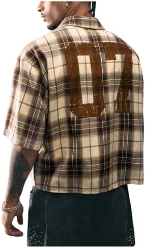 GORGLITTER Men’s Checkered Cropped Button Down Shirt Number Graphic Short Sleeve Vacation Crop Tops