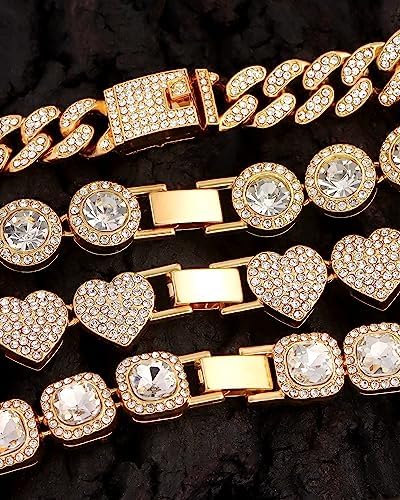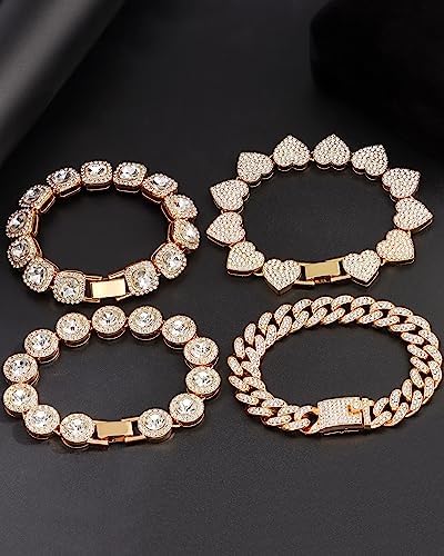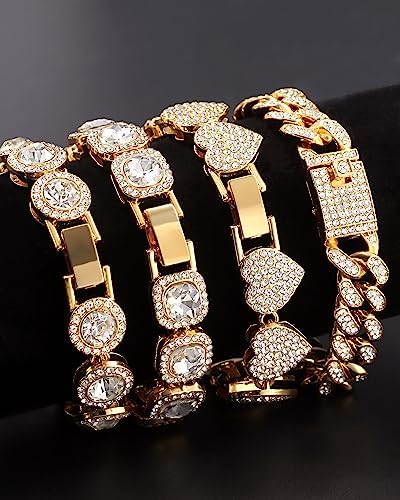 4PCS Gold Bracelets for Women Silver Clustered Tennis Bracelet for Women Heart Round Diamond Cuban Bracelet Layered Link Bracelet Set Fashion Jewelry for Women Set