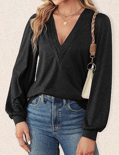 Agnes Urban Womens V Neck Long Sleeve Tops Dressy Casual Fall Shirts Puff Sleeve Loose Tunic Trendy Tops Blouses