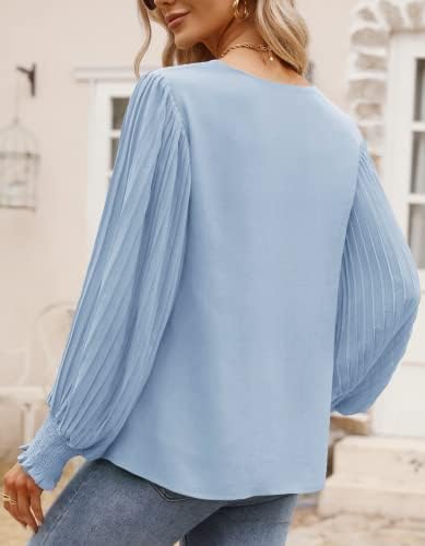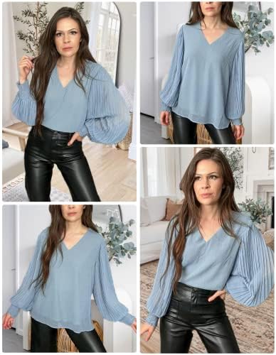Aifer Womens V Neck Chiffon Blouses Pleated Lantern Sleeve Flowy Dressy Tops Elegant Business Casual Outfits