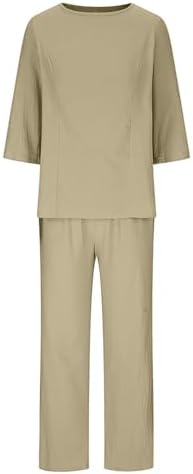 Akivide 2 Piece Outfits Solid Color Loose for Women Linen Sets Summer Casual Suit 3/4 Sleeve Top Wide Leg Pants with Pockets