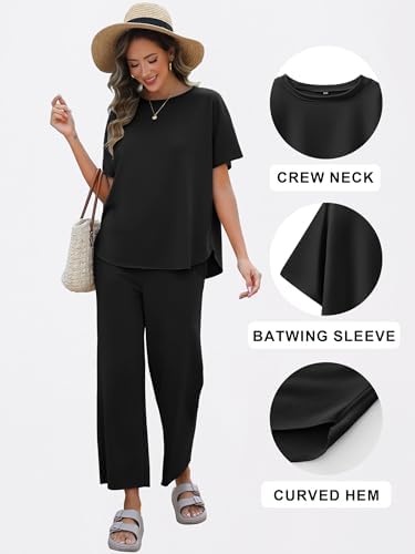 ANRABESS Women’s 2 Piece Outfits 3/4 Batwing Sleeve Top Wide Leg Crop Pants Sets 2025 Summer Beach Travel Lounge Set Clothes