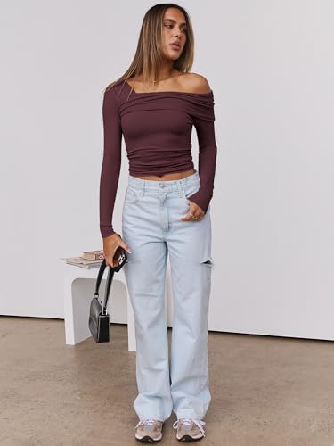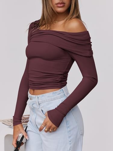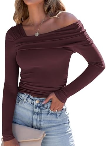 ANRABESS Womens One Off Shoulder Shirts Long Sleeve Going Out Crop Tops Ruched Tight Casual Blouse 2025 Trendy