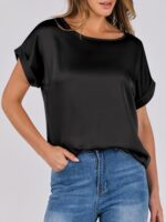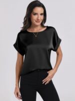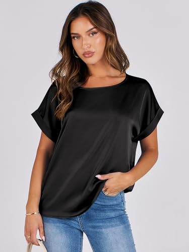 ANRABESS Women’s Summer Dressy Casual Short Sleeve Shirts Crewneck Silk Satin Business Office Work Blouse Tops
