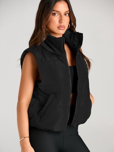 AUTOMET Puffer Vest Women Sleeveless Winter Cropped Outerwear Warm Puffer Lightweight Stand-up Collar Down with Pockets