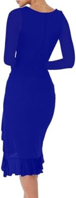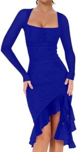 BORIFLORS Women’s Sexy Ruched Bodycon Midi Dresses Elegant Mesh Long Sleeve Square Neck Ruffle Hem Cocktail Party Dress