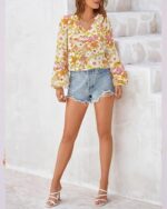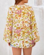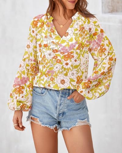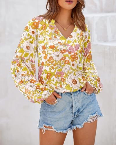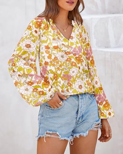 BTFBM Women Casual Boho Blouse Dressy Floral Puff Long Sleeve Shirts V Neck Lightweight Chiffon Summer Fall Tops 2025