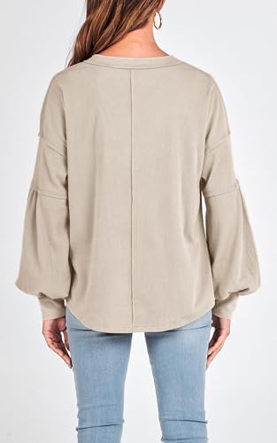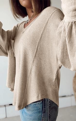 BTFBM Women’s Casual V Neck Ribbed Knit Shirts 2025 Fall Pullover Tunic Tops Loose Balloon Long Sleeve Blouses Top