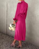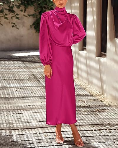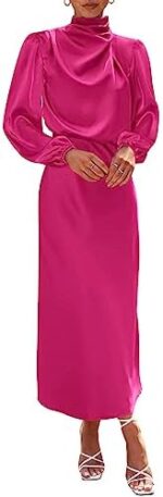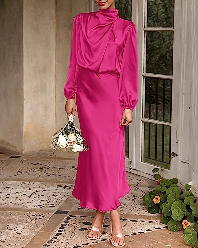 BTFBM Women’s Mock Neck Satin Dress Elegant Long Sleeve Elastic High Waist Formal Wedding Cocktail Party Maxi Dresses