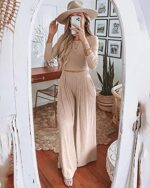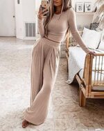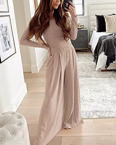 BTFBM Women’s Two Piece Lounge Set Long Sleeve Bodycon Ribbed Knit Crop Top Loose Wide Leg Pant Casual Outfits Sweatsuit