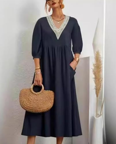 Cotton Linen Dress Women 2025 Boho V Neck 3/4 Sleeve Flowy Midi Dress Spring Fashion Casual Sundress for Beach Vacation