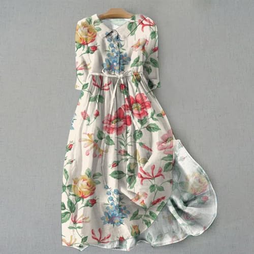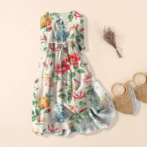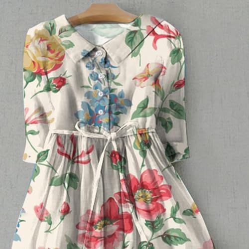 Cotton Linen Dresses for Women 2024 Maxi Button Down Plus Size A Line Dress Trendy 3/4 Sleeve Floral Dress Summer Dresses