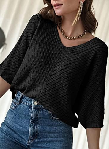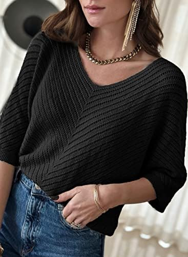 Dokotoo Women’s 2025 Summer Spring Casual 3/4 Sleeve Solid Color V Neck Loose Pullover Knit Fall Sweaters Tops