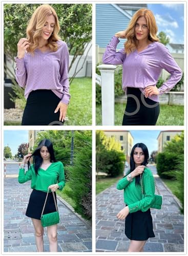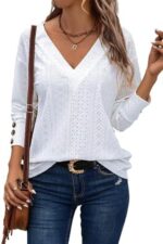 Dokotoo Women’s Tops Dressy Casual V Neck Long Sleeve Buttons Hollow Out Lace Embroidered Blouses Shirts