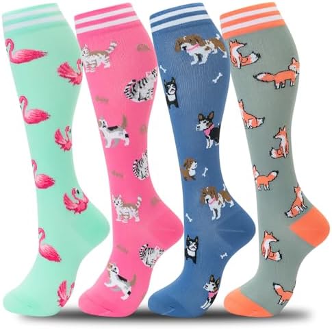 fenglaoda Compression Socks Women Men 4 Pairs, Knee High Support Socks for Running, Sports, Travel, Flight, Nurse