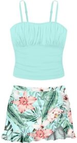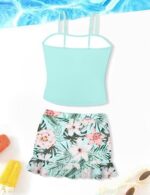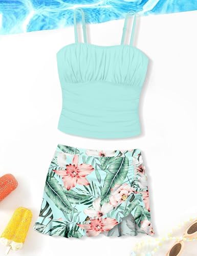 Girls Tankini Swimsuits Two Piece Tropical Print Pleated Bathing Suit with Ruffle Drawstring Skirt Swimwear 9-16T