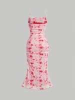 Home Trendy Festival & Party Wear GORGLITTER Women’s Floral Ruched Bodycon Midi Dress Mesh Sleeveless Fishtail Cami Dresses