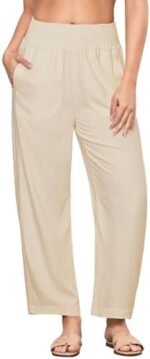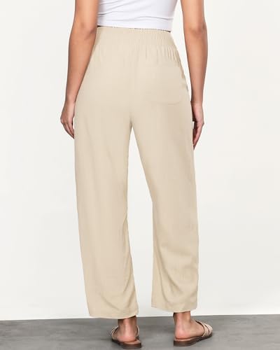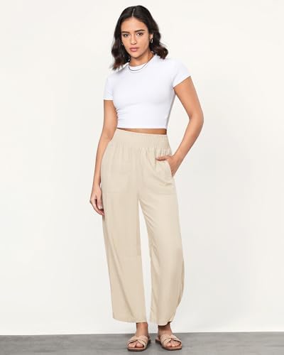 GRAPENT Linen Pants Women Wide Leg High Waisted Cropped Barrel Pull On Smocked Elastic Waist Summer Pants with Pockets