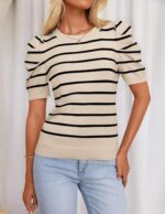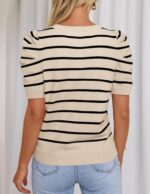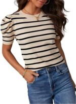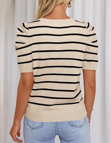 HAEOF Women’s 2025 Summer Short Puff Sleeve Knit Tops Trendy Crewneck Striped Shirts Dressy Casual Blouses