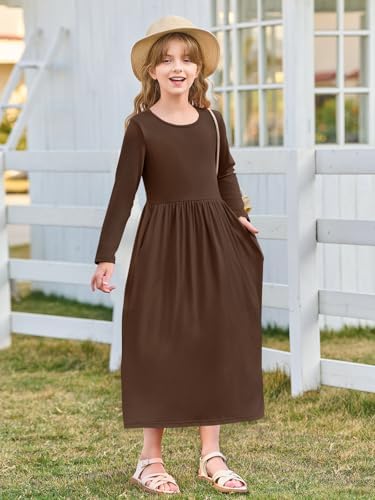 Haloumoning Girls Maxi Dress Long Sleeve Casual Holiday Dress with Pockets for 5-14 Years