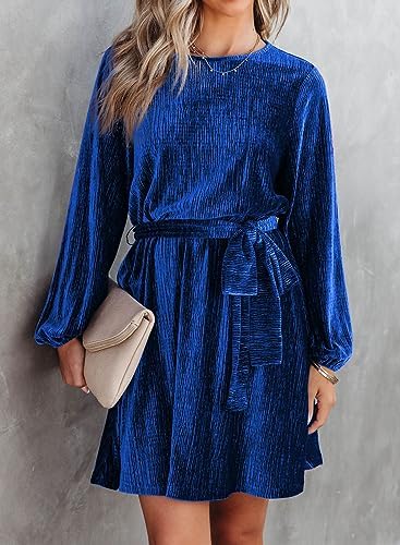 Happy Sailed Women’s Velvet Cocktail Dress Spring Fashion Lantern Sleeve High Waist A-Line Skater Party Dresses with Belt