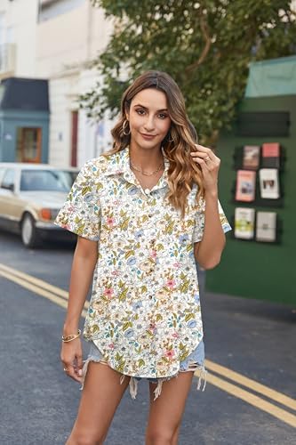 HOTOUCH Cotton Linen Button Down Shirt for Women V Neck Collared Blouse Casual Short Sleeve Tops with Pocket