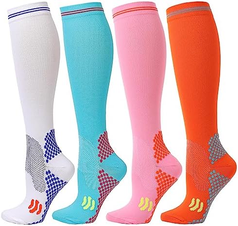Kickticks 4 Pairs Compression Socks for Woman & Man Unisex 20-30mmHg Knee high Plus Size Wide Calves for Flying Running…