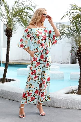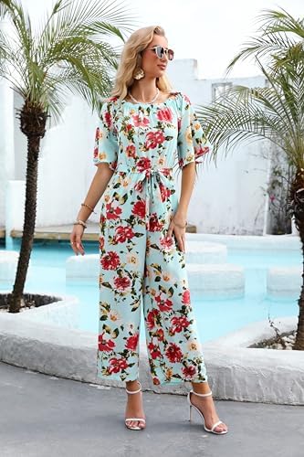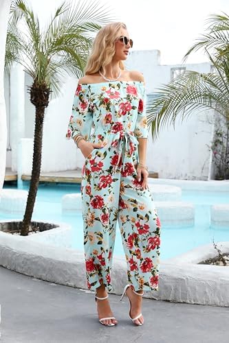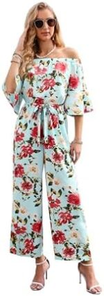Love Welove Fashion Jumpsuits for Women, Floral Off Shoulder Ruffled Short Sleeve High Waist Wide Leg Pants Romper Dressy