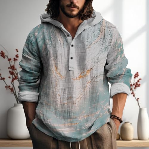 MARSVOVO Japanese Art Animal Hooded Shirt for Men Long Sleeve Quarter Button Lightweight Hoodie Cool Streetwear Tops