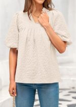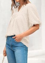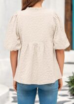 MASCOMODA Womens Summer Tops 2025 Ruffle V Neck Blouses Loose Puff Short Sleeve Jacquard Babydoll Tops Casual Dressy T-Shirts