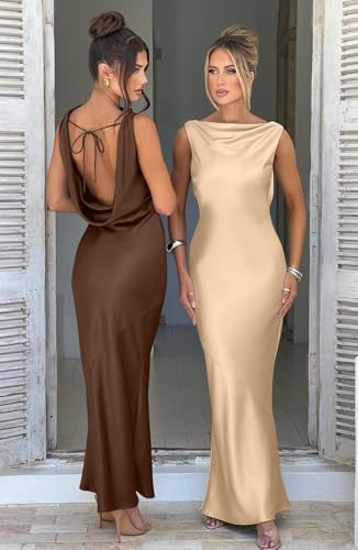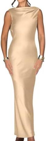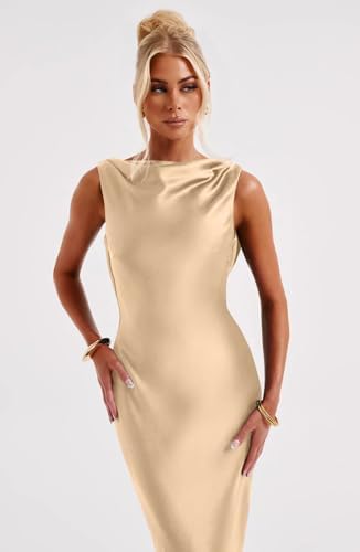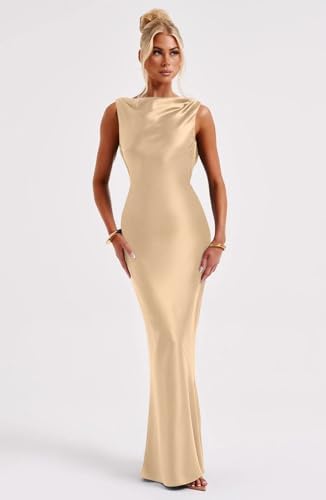 Memoriesea Women’s Satin Elegant Sleeveless High Neck Tie Cocktail Party Maxi Dress