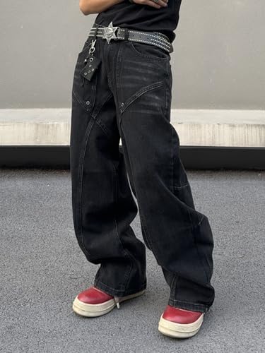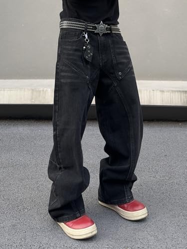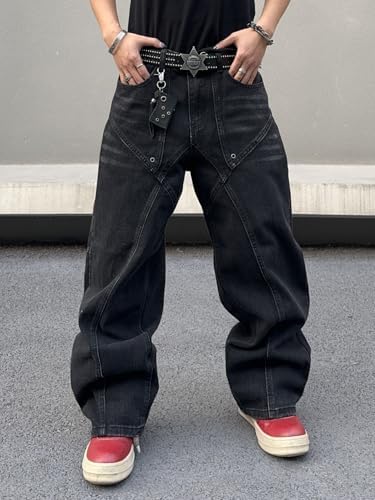 Men’s Irregular Sutures Y2k Baggy Jeans Hip Hop Wide Leg with Pockets Loose Fit Denim Pants