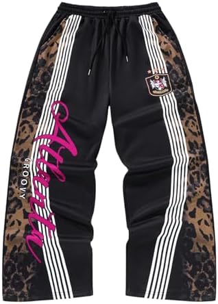 Men’s Y2K Leopard Print Baggy Sweatpants Vintage Side Stripe Drawstring Jogging Pants Streetwear