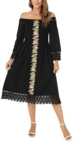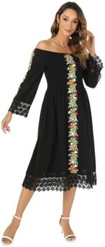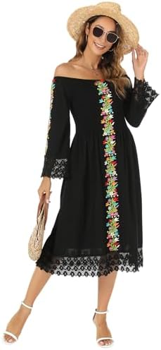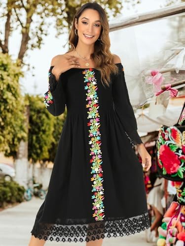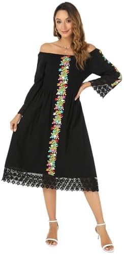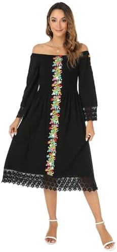 Mexican Dress for Women Embroidered Traditional Fiesta Dresses Style Long Sleeve Floral Diverse Embroidered Patterns