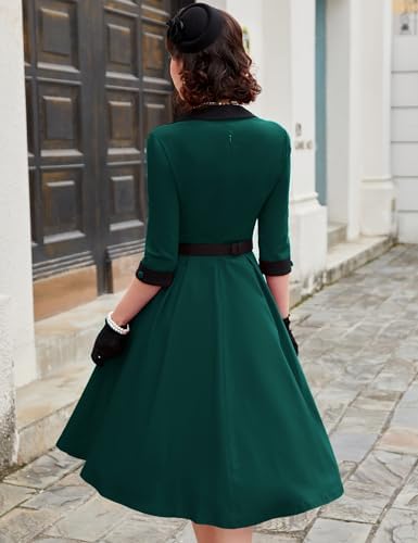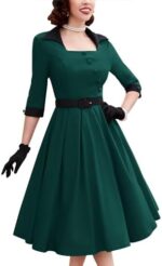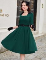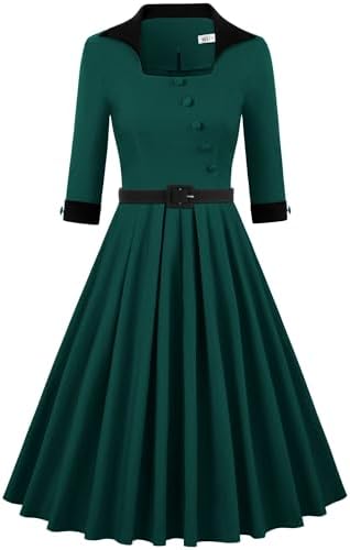 MUXXN Women’s 50s Retro Casual Swing Midi Dress 3/4 Sleeve Square A Line Neck Vintage Cocktail Wedding Guest Bodycon Prom