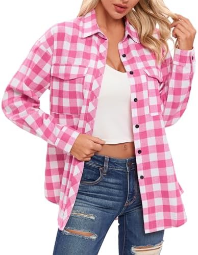 Oyamiki Womens Casual Cuffed Long Sleeve Boyfriend Button Down Plaid Flannel Shirt Tops