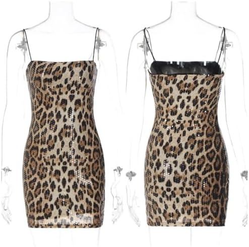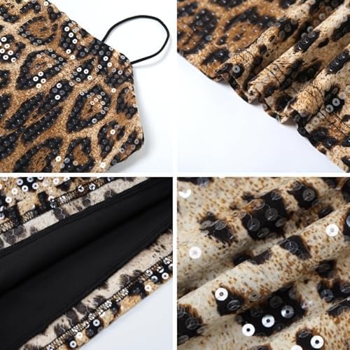 RARITYUS Women’s Glitter Sequin Leopard Print Mini Dress Sexy Sleeveless Spaghetti Strap Bodycon Short Dress Party Club Dress