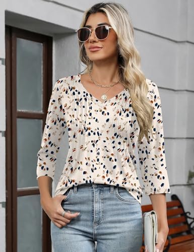 Romanstii Shirts for Women 2025 Summer 3/4 Length Sleeve Womens Tops Dressy Casual Pleated Blouses V Neck Tee Shirts S-3XL