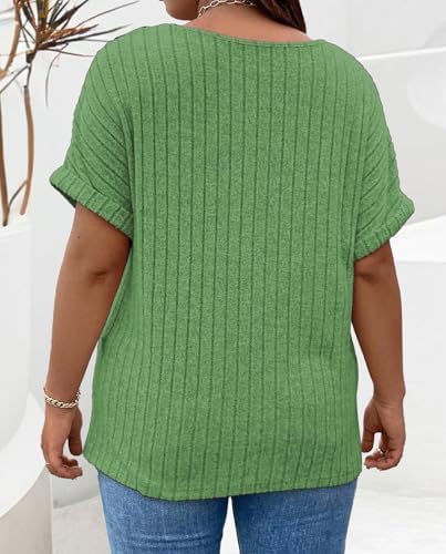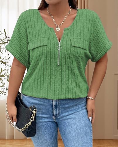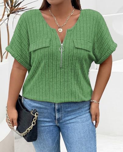 Short Sleeve T-Shirt for Womens Zipper V Neck Ribbed Solid Color Blouse Summer Casual Lightweight Shirts Tops