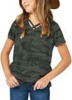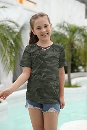 simtuor Girls Camouflage Stripe Short Sleeve Shirts V Neck Criss Cross Tees Sweat Kids Casual Sport Tops Blouse(4-15T)