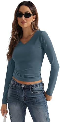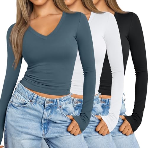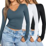 SUNBS Womens 3 Pack Long Sleeve Shirts V Neck Going Out Slim Fit Causal Crop Layering Tops 2025 Fall Fashion Clothes