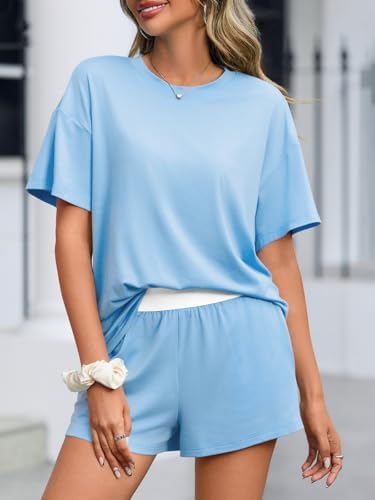 Tankaneo Womens 2 Piece Lounge Sets Summer Outfits Short Sleeve Tee Tops Elastic High Waist Shorts Matching Set