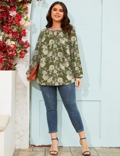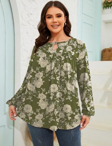 TFSDOD Women Plus Size Tops Long Sleeve Shirts V Neck Pleated Keyhole Blouse Loose Work Tunic Tee 1X-5X