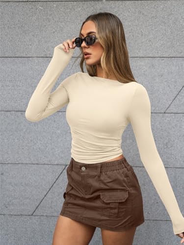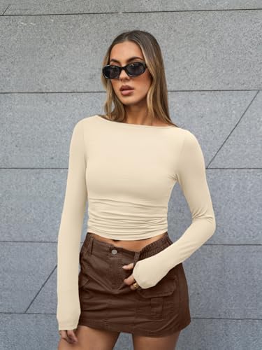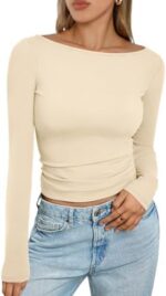 Trendy Queen Women’s Boat Neck Tops Long Sleeve Shirts Casual Fitted Tee Shirts Solid Color Fall Basic Clothes