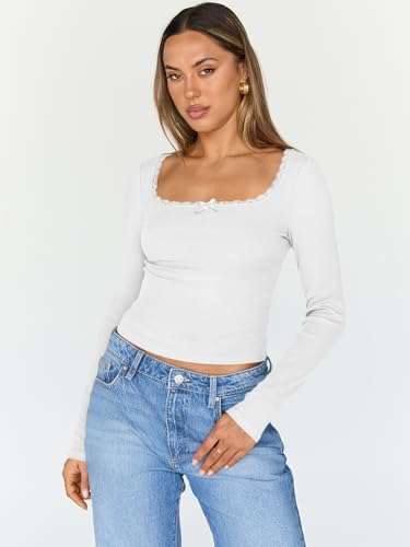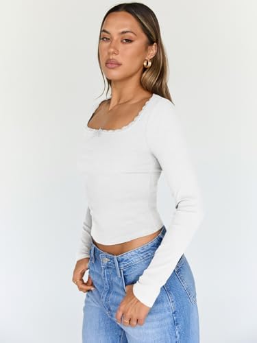 Trendy Queen Womens Long Sleeve Shirts Crop Square Neck Ribbed Tops Basic Slim Fit Y2K Fall Winter Clothes Outfits 2025