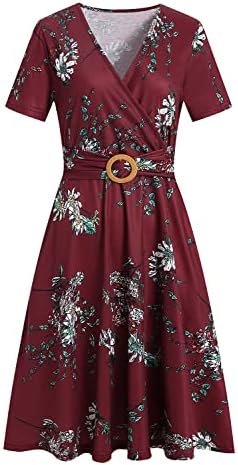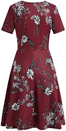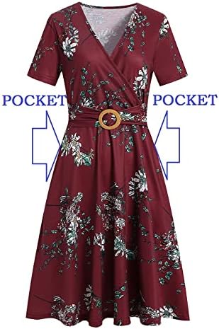 Home Trendy Festival & Party Wear Women’s Elegant Criss-Cross V Neck Vintage Short Sleeve Work Casual Fit and Flare Tea Dress with Pockets 980