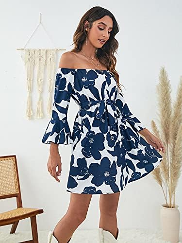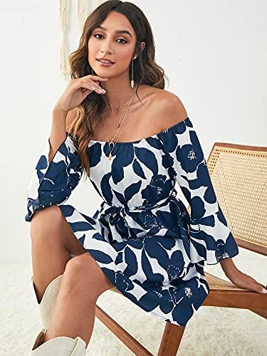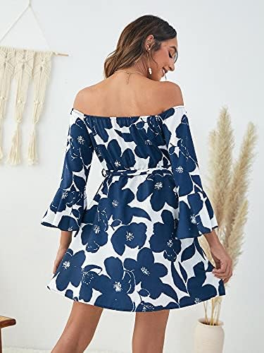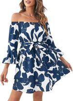 Womens Off Shoulder Ruffle Floral Summer Wedding Guest Dresses A Line Shift Short Skater Dress with Belt