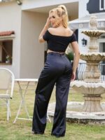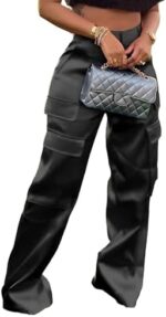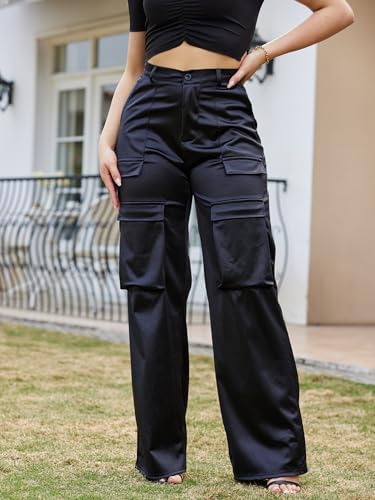 Women’s Satin Cargo Wide Leg Pants Silky Dressy Relaxed Casual Pocketed Long Trouser