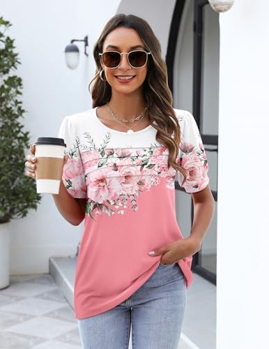 Zeagoo Womens Short Sleeve Tops Floral Boho Shirts Pleated Crewneck Summer Outfit Puff Sleeve Blouses Casual Tunic